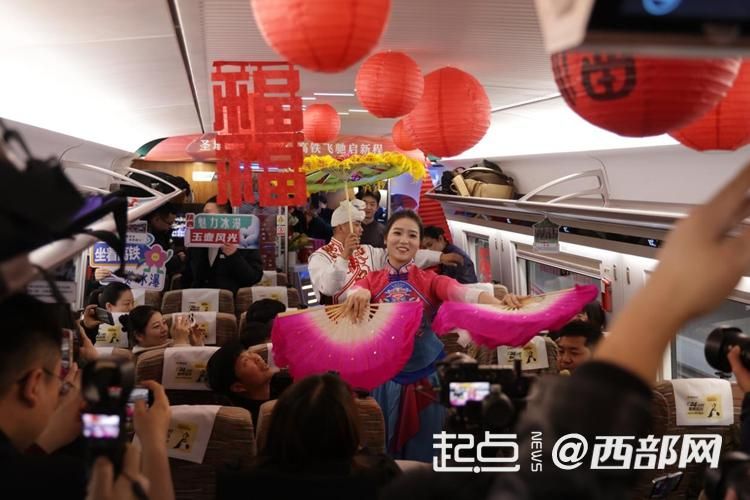 延安至北京首发列车被精心打造成“流动的文化长廊”。车厢内互动墙上写满旅客的寄语。陕旅集团“金延安”演员上演情景剧《高铁赴延》,延安革命纪念馆讲解员动情讲述《南泥湾的耕耘》,安塞腰鼓非遗传承人高塞东带领团队在车厢中击鼓起舞,鼓声铿锵仿佛在诉说黄土高原的千年回响。